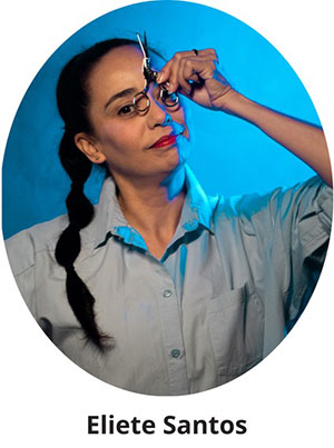 Eliete Santos, nascida em São José dos Campos, em 1975 é artista das artes cênicas e visuais. Em 2017, ingressou como bolsista da União Europeia no Mestrado em Práticas Artísticas em Artes Visuais na Universidade de Évora, em Portugal, onde iniciou sua pesquisa em memória e protagonismo feminino por meio da técnica da colagem analógica. Em 2018, realizou sua primeira exposição individual na Europa, paralelamente à sua atuação como bailarina, criadora e intérprete solista no sul ibérico.